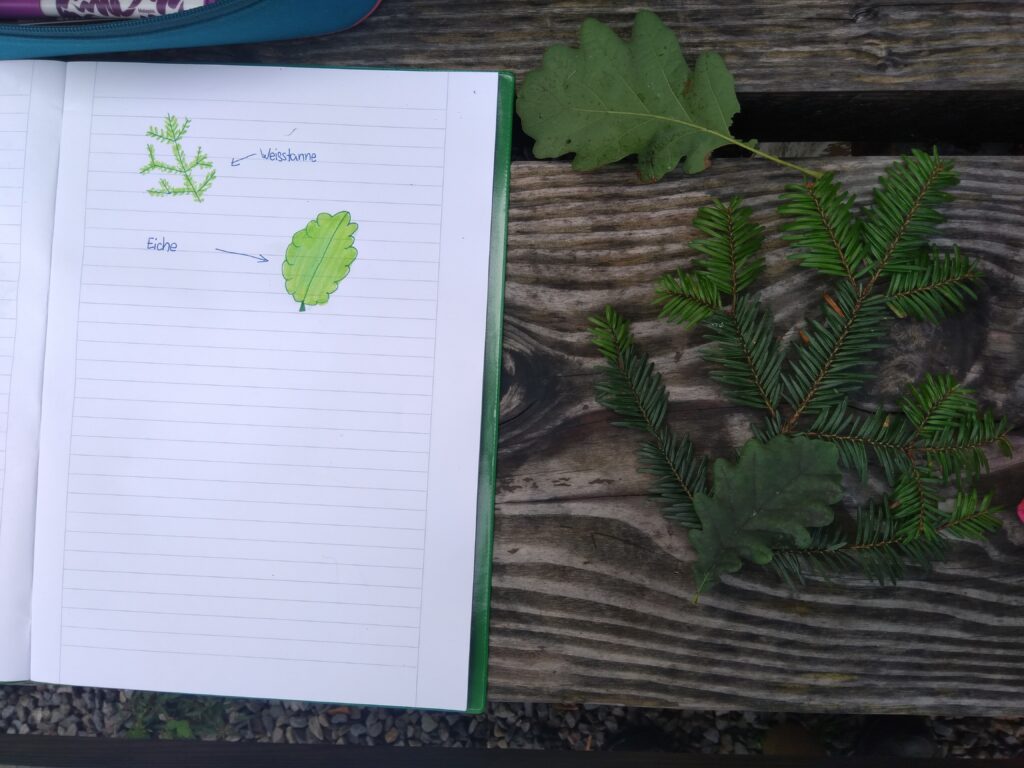 Schüler/innen erarbeiten die Baumarten anhand von einem Buchstabenrätsel und zeichnen die Blätter in ein Waldheft.